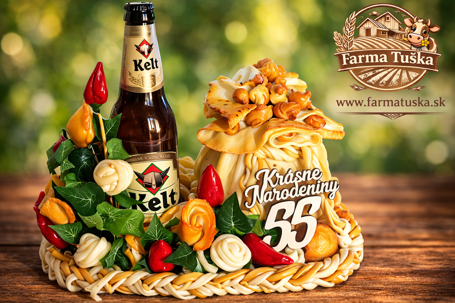 Naša syrová torta predstavuje jedinečnú remeselnú kompozíciu zo syra, ktorá vzniká ručne na farme v lokalite Kosorín, Slovensko. Každý kus pripravujeme individuálne, preto ide vždy o originálny výrobok. Torta má základ z údenej ochutenej parenice a je doplnená o udený syrový meštek plnený syrovými uzlíkmi rôznych chutí.. Celú kompozíciu dopĺňa kytica syrových ruží a flaška pivka samozrejme podľa Vašej požiadavky.