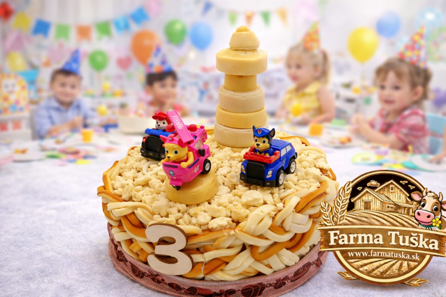 Základ tvorí kruhová vypletaná syrová torta z kvalitných parených syrov, pričom každý kus vzniká s dôrazom na tradičné remeslo. Následne tortu dopĺňame o tematické dekorácie inšpirované obľúbenou Labkovou patrolou, a tak vzniká jedinečný vizuálny aj chuťový zážitok.